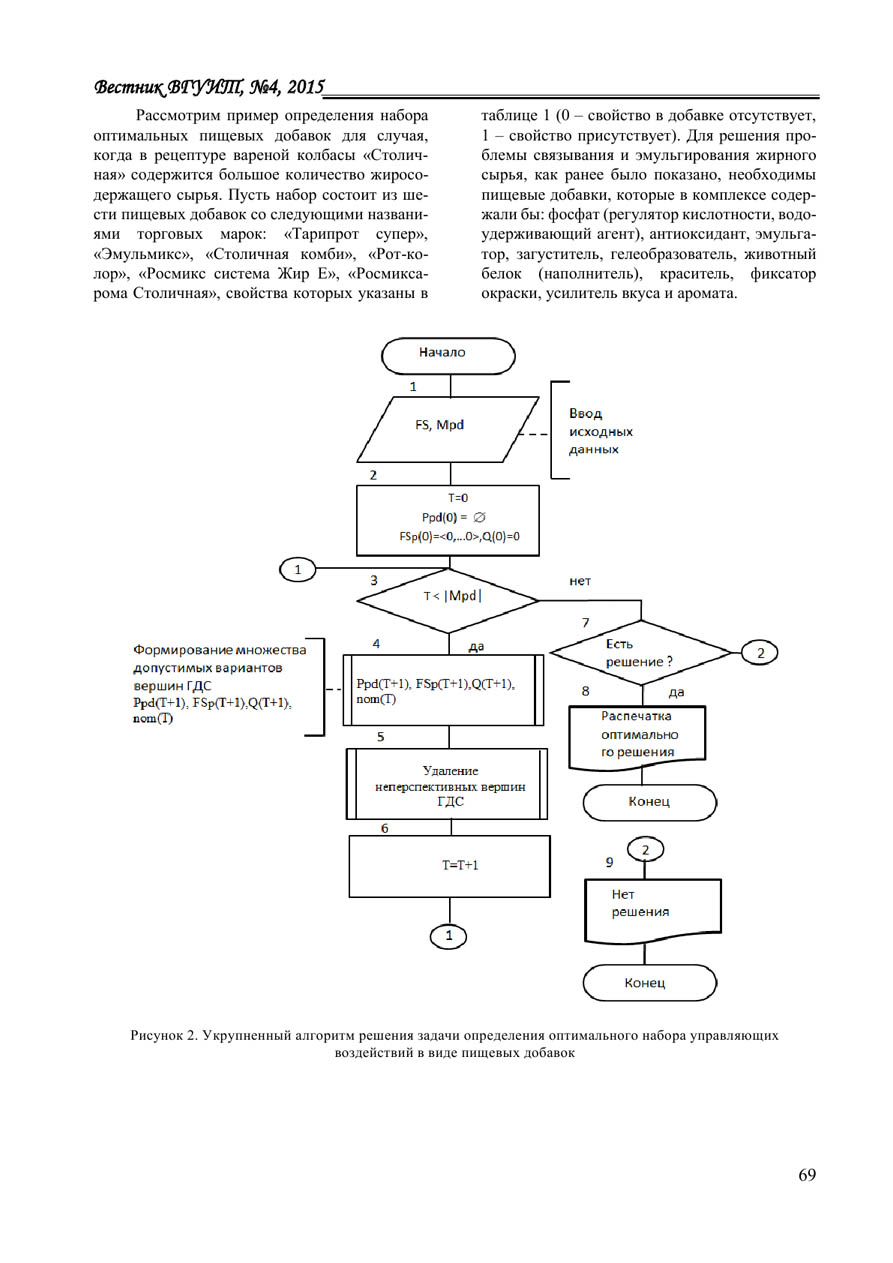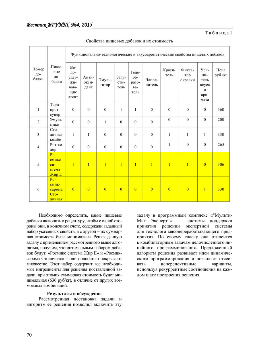 В статье рассматривается задача оптимизации управляющих воздействий в виде пищевых добавок в рецептурах колбасных изделий для устранения дефектов в мясном сырье при управлении производством. Предложена математическая постановка задачи и алгоритм ее решения. Формально задача классифицируется как комбинаторная задача целочисленного линейного программирования, целью которой является обеспечение набора функционально-технологических и вкусо-ароматических свойств конечного продукта при минимальной стоимости единицы массы пищевых добавок. Предложенный алгоритм решения реализует метод пошагового построения решения с отсевом неперспективных вариантов, определяемых на основе рекуррентных соотношений. Рассмотрен пример определения набора оптимальных пищевых добавок для конкретного производственного случая, когда в рецептуре вареной колбасы «Столичная» содержится большое количество жиросодержащего сырья. Для решения проблемы связывания и эмульгирования жирного сырья, как показано в статье, необходимы пищевые добавки, которые в комплексе содержали бы: фосфат (регулятор кислотности, водоудерживающий агент), антиоксидант, эмульгатор, загуститель, гелеобразователь, животный белок (наполнитель), краситель, фиксатор окраски, усилитель вкуса и аромата. Для примера был представлен набор из шести разных пищевых добавок с указанием их функционально- технологических и вкусоароматических свойств, а также стоимости. Необходимо было определить, какие из этих пищевых добавок включить в рецептуру, чтобы с одной стороны они, в конечном счете, содержали заданный набор указанных свойств, а с другой - их суммарная стоимость была минимальна. Решая данную задачу с применением рассмотренного алгоритма, нашли оптимальный набор пищевых добавок, которые полностью покрывают множество. Этот набор содержит все необходимые ингредиенты для решения поставленной задачи, при этом их суммарная стоимость является минимальной, в отличие от других возможных комбинаций. Рассмотренный алгоритм реализован в программной системе “МультиМит Эксперт” в системе поддержки принятия решений.