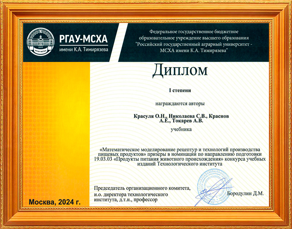 Авторский коллектив учебника «Математическое моделирование рецептур и технологий производства пищевых продуктов», в который вошли учёные из нашей научно-исследовательской группы, стали призёрами в номинации по направлению подготовки 19.03.03 «Продукты питания животного происхождения» конкурса учебных изданий Технологического института РГАУ-МСХА имени К.А. Тимирязева и награждены дипломом I степени.