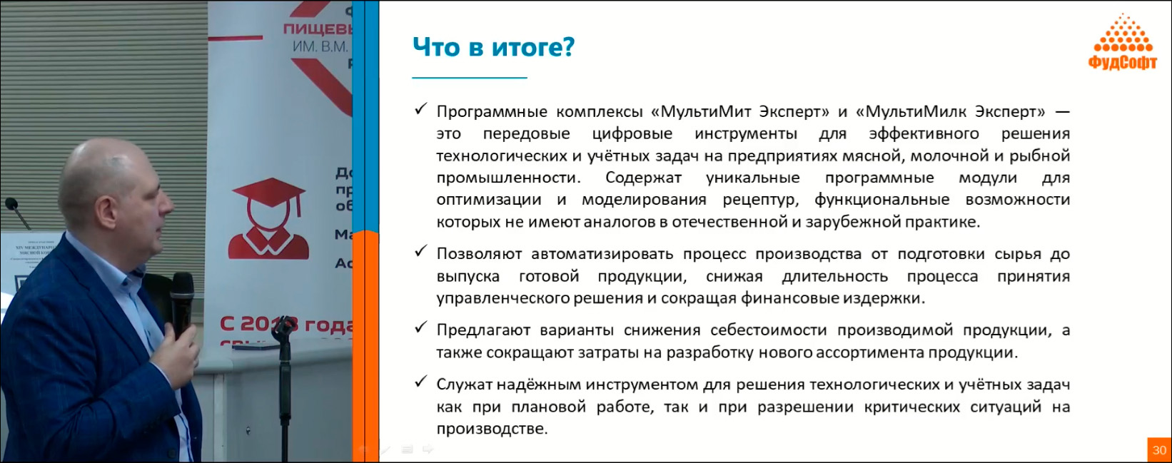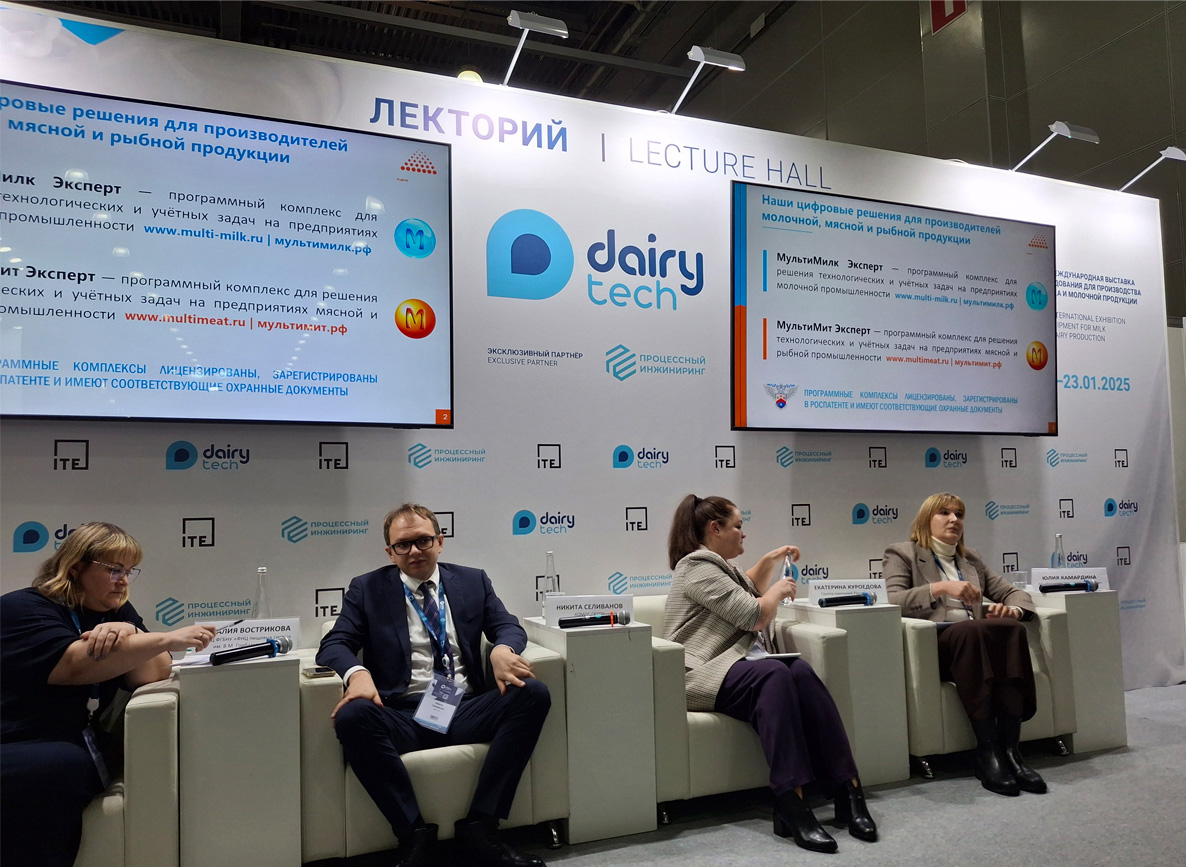 Специалисты нашей компания также приняли участие в деловой программе выставки и выступили с докладом «Программный комплекс "МультиМит Эксперт" и "МультиМилк Эксперт" — обеспечение устойчивого развития и качества мясного и молочного производства».