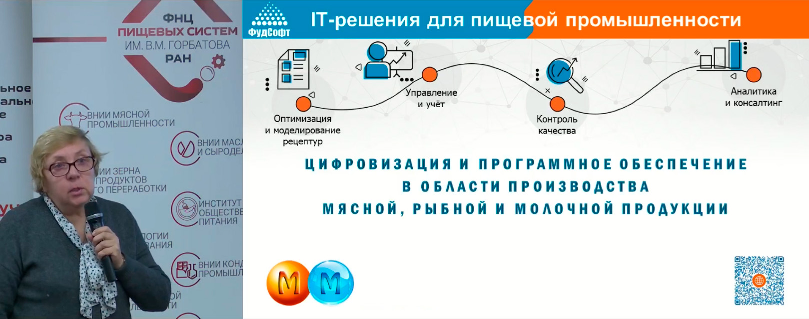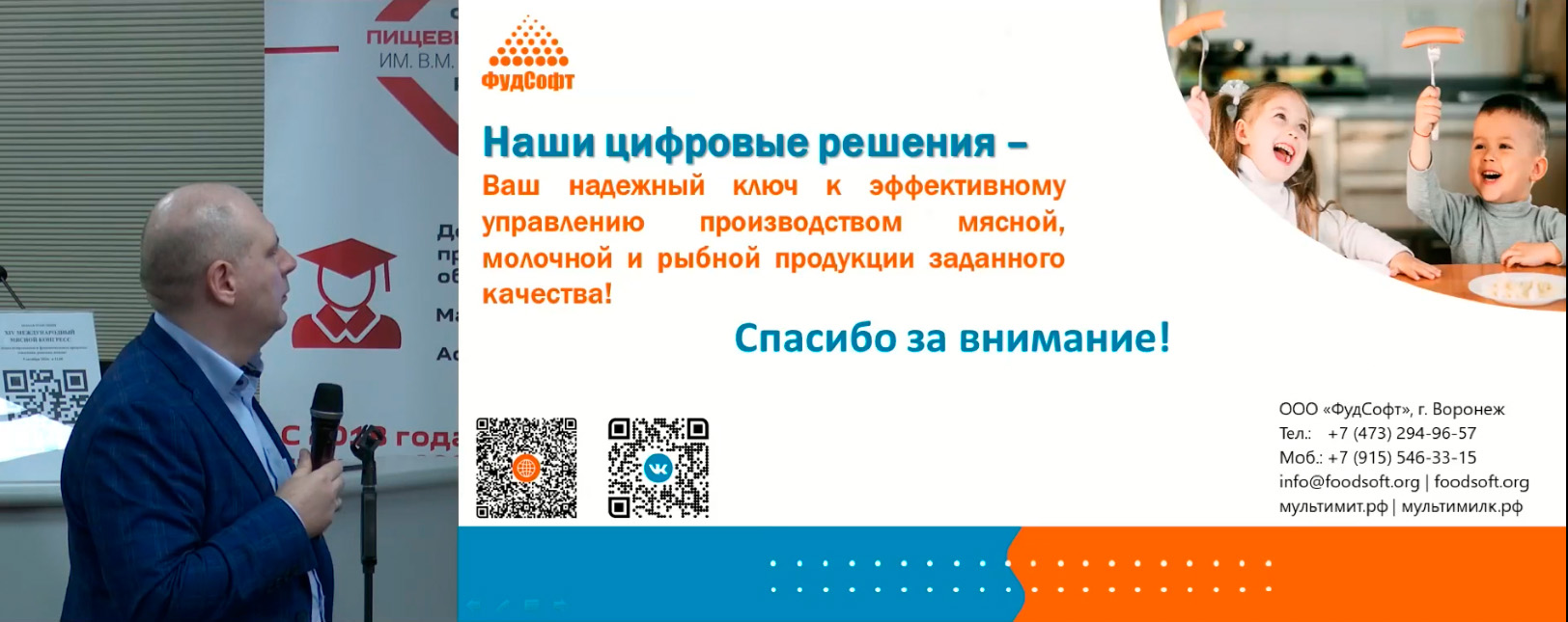 На конгрессе специалисты компании «ФудСофт» совместно с содокладчиком Ольгой Николаевной Красулей, доктором технических наук и профессором РГАУ-МСХА имени К.А. Тимирязева, представили доклад «Цифровизация и программное обеспечение в производстве мясной, рыбной и молочной продукции». В докладе были затронуты проблемы, возникающие при производстве данных видов продуктов, включая специализированное и функциональное питание, и их преодоление с помощью передовых цифровых инструментов для эффективного решения технологических и учётных задач на предприятиях мясной, молочной и рыбной промышленности - программный комплекс «МультиМит Эксперт» и «МультиМилк Эксперт».
