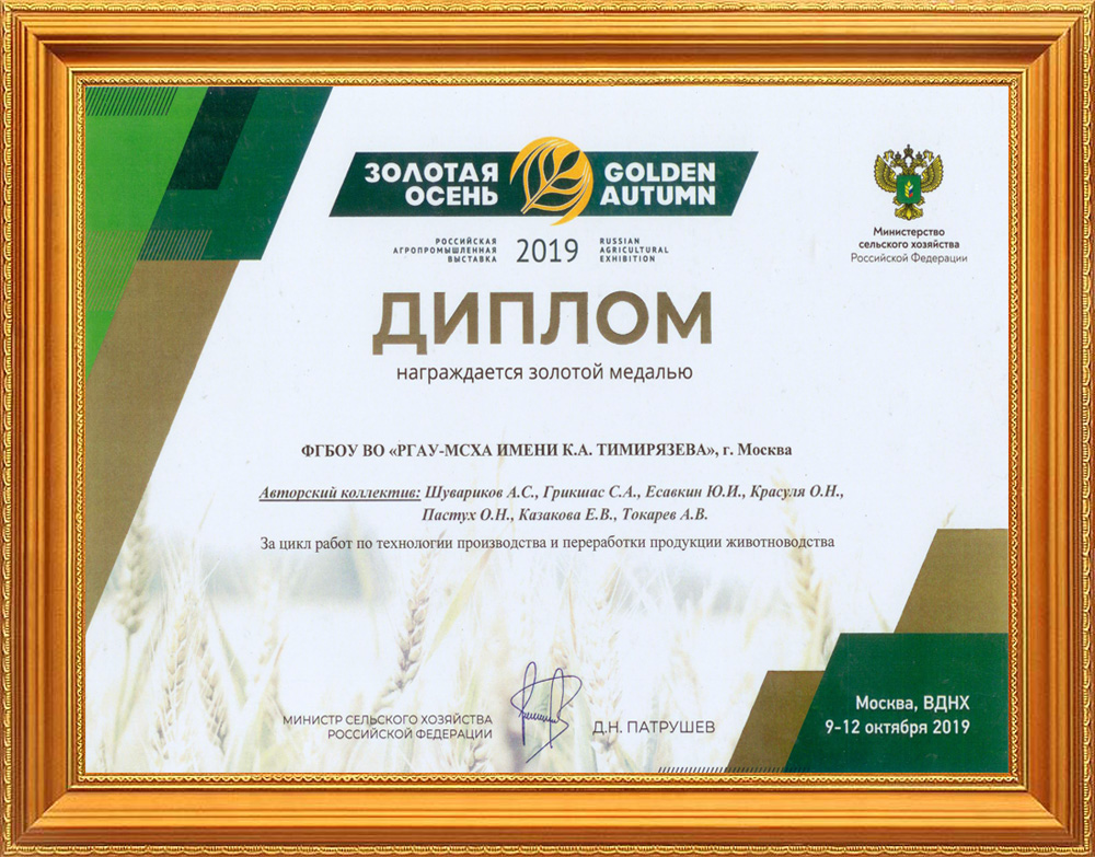 21-я Российская агропромышленная выставка "Золотая осень" прошла с 9 по 12 октября 2019 года в Москве, на территории ВДНХ. Авторский коллектив из учёных "РГАУ – МСХА имени К.А. Тимирязева" и руководства нашей компании был награжден Министерством сельского хозяйства РФ золотой медалью за цикл работ по технологии производства и переработки продукции животноводства.